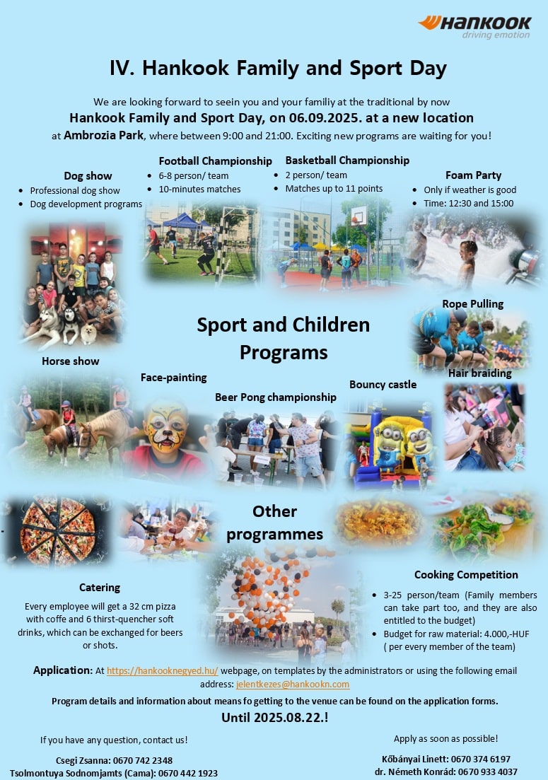 Printable application form with detailed programme description and bus timetable is available here: Jelentkezési lap, program, buszmenetrend Would you apply online? You can also register here by filling in the fields below: Employee name: Employee ID: Programme(s) I wish to participate in: Football I do not wish to participateI will participate in the morning (9:15 - 13:15)I will participate in the afternoon (14:50 – 18:20)All day Team name: Basketball I do not wish to participateI will participate in the morning (9:15 - 13:15)I will participate in the afternoon (14:50 – 18:20)All day Team name: Rope pulling I do not wish to participateI will participate in the morning (9:15 - 13:15)I will participate in the afternoon (14:50 – 18:20)All day Team name: Beer pong I do not wish to participateI will participate in the morning (9:15 - 13:15)I will participate in the afternoon (14:50 – 18:20)All day Team name: Cooking competition I do not wish to participateAll day Team name: Viewer I do not wish to participateI will participate in the morning (9:15 - 13:15)I will participate in the afternoon (14:50 – 18:20)All day Details of participating family members: Name: Date of birth: Selected programme: Children's programmeCooking competitionViewer Name: Date of birth: Selected programme: Children's programmeCooking competitionViewer Name: Date of birth: Selected programme: Children's programmeCooking competitionViewer Name: Date of birth: Selected programme: Children's programmeCooking competitionViewer Name: Date of birth: Selected programme: Children's programmeCooking competitionViewer Name: Date of birth: Selected programme: Children's programmeCooking competitionViewer Name: Date of birth: Selected programme: Children's programmeCooking competitionViewer To enter the cooking competition, click on the button below to submit your ingredients request: Register for the cooking competition Here is a taste of the atmosphere of our previous family and sports day